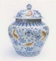 说 明: 以幽青雅致的青花绘莲花和藻萍,鲜艳的黄上红彩绘十二尾游鱼.罐底青花双圈"大明嘉靖年制"款.画面生动,纹饰疏密均匀.