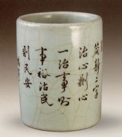 说 明: 通体灰青釉,开大纹片.落款为蜗寄题.蜗寄,是清督陶官唐英的名号.这件笔筒是唐英督陶期间精心策划的产物.