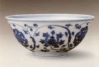 说 明: 此碗胎薄,器型精巧,纹饰具有图案化效果,碗心团花较别致,釉质莹润,青花呈色淡雅.