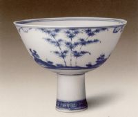 说 明: 成化时期高足碗碗身所占比例大,足柄较短,形成了这一时期高足碗的特点.明成化时期松竹梅纹风格清秀淡雅.