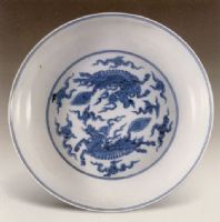 说 明: 青花大盘,绘麒麟纹饰极为少见,盘的外口沿处书"大明成化年制"六字款,盘底无釉,有黄黑色斑点,称作"米糊底",亦为成化时期特有现象.