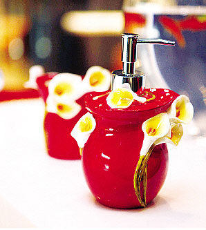 制造陶瓷一向是中国人的拿手技术,这个乳液瓶和牙刷架采用了整体烧制的手法,花朵造型逼真,再搭配接近透明的材质,赋予卫浴一种别样的美感。