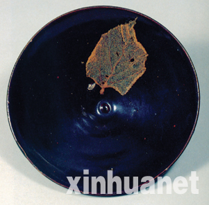 木叶天目茶碗,口径14.7厘米,南宋时吉州窑产品。碗呈斗笠形,斜直壁,小底,圈足,是宋代流行的典型的茶碗样式。碗内壁黑色的釉面上贴一褐黄色的树叶,叶脉清晰可辨,惟妙惟肖,极富天趣。其装饰工艺是将天然树叶经腐蚀处理后,贴在素器上,施釉焙烧,树叶的形状及脉络便清晰地留在器壁上。这种装饰方法是宋代吉州窑独特的创造,经常装饰于黑油茶盏的内壁上。有单片树叶的,也有两片或三片树叶叠在一起的,或残叶稀疏,或满叶铺地,在黑色釉面的映衬下,好似水面上漂浮的片片落叶,颇合文人情趣,使之在品茶之余 ,也收获了一份诗情雅韵。此件茶碗也是一件流传有序的收藏品,经加贺前田家传来,被指定为重要文化财。