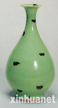 青釉点彩铁斑纹玉壶春,高27.4厘米,元代龙泉窑产品。是大阪东洋陶瓷美术馆收藏的中国陶瓷中的另一件国宝。它有微微敞开的喇叭口,修长的瓶颈,柔顺的溜肩,稍有下垂的圆腹,大小适中的圈足,优美的轮廓线既流畅又有跌宕起伏,整体造型既中规中矩,又婉约动人,可为完美至极。而更为诱人的还是那如同美玉一般的釉色,光泽柔和透亮,浓翠莹润,恰似青梅色泽,因此,这种釉色又被称为"梅子青"。此种釉色是龙泉窑于南宋时创烧,它对瓷胎的白度要求较高,釉料采用在高温下不易流动的石灰碱釉,在1250℃~1280℃之间的高温和较强的还原气氛下烧造,釉面的玻璃化程度高且略透明。釉面上的褐斑是元代龙泉窑继承唐代越窑青瓷而来的装饰方法,它给造型及纯净的釉色增添了一种动感。此件器物原由鸿池家族收藏,后传入该馆。
