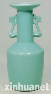 青釉凤耳瓶,高28.8厘米,南宋龙泉窑鼎盛时期的制品。被指定为日本重要文化财。瓶盘口,长颈呈直筒状,斜折肩,桶形腹至底部微收,凹足。与形体曲折婉转的玉壶春瓶迥然不同的是,这件青瓷瓶的形体轮廓线几乎全以直线组成,就连颈部的凤形双耳也是挺直了脖颈,使整体造型具有了挺拔、庄重的艺术效果。此瓶的釉色为南宋时龙泉窑创烧的粉青釉,色调青绿、粉润,优雅,犹如半透明的青玉雕就。粉青釉也是石灰碱釉的一种,它以铁的氧化物为主要呈色剂,还有少量的锰和钛。粉青釉的成因首先是因石灰碱釉高温粘度较大,高温下不易流釉,这样釉层就可施得厚,使器物的釉色通过适当的温度和还原气氛达到柔和淡雅的玉质感;其次是粉青釉的釉层中含有大量的小气泡和未熔石英颗粒,它们使进入釉层的光线发生强烈散射,从而使其在外观上获得一种和普通玻璃釉完全不一样的视觉效果。