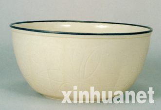 白瓷刻花莲纹洗,日本重要文化财,宋代定窑产品。此器口径24.5厘米,直口,深腹,平底,凹足。胎土洁白,质致密,器壁薄。器身内外壁均刻有莲花纹样,线条流利。口沿无釉为芒口,以金属扣边,为定窑鼎盛时期的代表作品。定窑是宋代五大名窑之一,窑址在今河北曲阳一带,创烧于唐代早期,终于元代。其大宗产品为白釉,胎白质坚,薄胎,釉色白中泛牙黄,并因覆烧形成无釉的芒口。在定窑窑址和墓葬及传世定窑器上的题款均发现有刻"尚食局"、"尚药局"及"奉华"、"德寿"、"慈福"等皇家机构和宫殿建筑的名称,说明定窑在北宋时曾为宫廷和官府烧制瓷器,由此可见其产品的优良品质。
