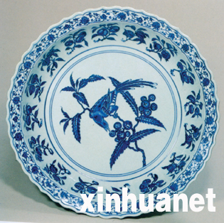 青花花鸟纹盘,口径50.5厘米,明永乐时期景德镇窑所烧制。日本重要文化财,是最早进入安宅收藏视野的一件明代青花瓷器。盘口呈菱花形,折沿上绘有二方连续卷枝番莲纹,内壁散点式布置16组折枝花果纹,有石榴、荔枝、桃实、枇杷等果实,外壁口沿绘海水江牙纹,腹部也是绘16组折枝花卉纹,内外互相呼应。盘的内底中央则绘有一绶带鸟栖于枇杷枝上啄食果实,形态活泼生动,宛如中国画的折枝花鸟图。永乐宣德时期的青花瓷器以其胎釉精细、青色浓艳、造型多样和纹饰优美而负盛名,被称为我国青花瓷器的黄金时代。这一时期的青花料多为波斯进口的所谓"苏麻离青",且原料加工精致,白釉很纯净。画瓷艺术也更具有中国水墨画风格,画面布局疏朗,文人情趣益加浓厚。
