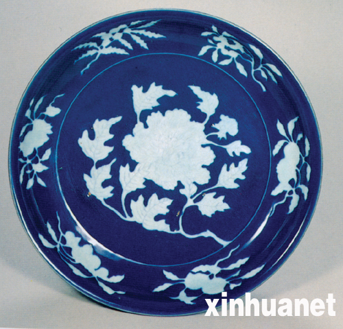 蓝地白花牡丹纹盘,明宣德景德镇窑制品,口径38.7厘米。重要文化财。盘敞口外撇,腹较深,坦底,通体施蓝釉,并在器内底及内外腹壁上均加绘白色花纹。在外壁一侧的白色长方框内书蓝色"大明宣德年制"六字款。