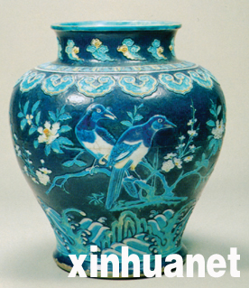 法华花鸟纹大壶,明代景德镇窑烧制,高44.5厘米,重要文化财。法华也称"珐华",是一种特殊的陶瓷艺术,用特制带管的泥浆袋在陶胎表面勾勒出凸线或堆贴纹饰轮廓,然后分别施黄、白、绿、紫等各种低温釉料填底子和花纹色彩,入窑烧成。法华器的烧制技术源于琉璃,但法华釉用牙硝作熔剂,而琉璃则用铝为熔剂。据《饮流斋说瓷》载:"法华之品萌芽于元,盛行于明,大抵皆北方之窑。"法华有陶胎与瓷胎之别。陶胎法华多为山西所烧,常见制品有香炉、花瓶及动物等。瓷胎法华由景德镇于明宣德时期开始烧制,兴盛于明代中期。瓷胎法华烧成温度高,器型有较大件的瓶、缸、钵等,彩料及装饰也更为丰富和考究,艺术效果高雅。此件法华器为瓷胎,器形高大,形体轮廓线婉转秀丽。装饰以绘画式与纹样式相结合,颈肩部依次饰适合纹样灵芝云、莲瓣纹、云肩纹,严谨整齐;腹部饰两组花鸟纹,诗意盎然;下部饰海浪纹,浪花翻滚。釉料色调丰富,以珐蓝釉为地,并在纹样轮廓线内分别填上白色的花朵和浪花,黄色的花蕊,孔雀绿的羽毛和海浪。纹样层次丰富,但繁简得当,色调搭配鲜明而又雅致,是法华器中的一件杰作。