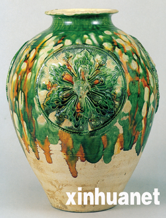 三彩贴花宝相花纹壶,唐代器物,高30.9厘米,被指定为重要美术品。撇口,短颈内束,广肩鼓腹,凹足,形体高大端庄。器身以白釉涂成白色斑点 ,再以绿釉、褐釉间施以其间,颇具蜡染的效果。壶腹贴有三组宝相花与海石榴纹相结合组成的圆形图案,图案周以连珠纹相围。海石榴系从伊朗传入,进入中国本土后,常与宝相花、莲花、葡萄等相配,其形象或是在盛开的花朵中心露出绽开的石榴果,或花苞之中满是石榴籽。海石榴纹最早出现于唐三彩陶器上。此件三彩器上颇似蜡染的釉面及海石榴和连珠纹的装饰题材都深受西亚文化的影响。