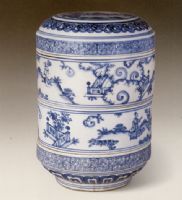 说 明: 盒体呈灯笼式,分为三层.全器纹饰构图层次清楚,青花色泽淡雅,釉质莹润,为正德青花瓷器中的上乘之作.