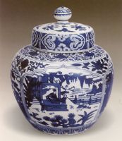 说 明: 造型雄浑饱满,是嘉靖朝盖罐的典型式样.青花艳丽明快,蓝中泛紫.画面人物形神兼备,特征鲜明,陪衬的景物切合主题,可谓情景交融.具有工笔画的艺术风格.