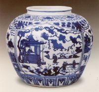 说 明: 此罐胎体厚重坚硬,形体饱满古朴,嘉靖朝的典型式样.青花色调绚丽,蓝中泛紫.画面清新雅致,人物形象生动,代表了这一时期的绘画风格.