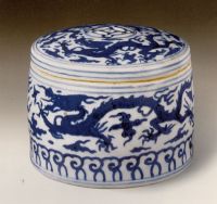 说 明: 器型浑圆,釉面肥润光亮,白中闪青.足内青花双圈楷书"大明隆庆年造"六字款.字体笔画苍劲有力,此罐具有鲜明的时代特征.