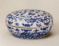 说 明: 此盒胎体厚重,青花色调蓝中泛紫,浓艳欲滴.纹饰描绘精细.所绘人物形象较夸张,四肢圆胖,后脑大,头重脚轻,比例失调,这种绘画风格具有鲜明的时代特色.