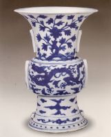 说 明: 此觚仿古铜器式样烧造而成.胎体厚重,造型古朴雄浑.青花发色艳丽,纹饰布局合理,具有极高的艺术欣赏价值.