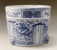 说 明: 此器为直筒形,口略大于底,白釉泛灰,青花亦泛灰,砂底露胎.该件当为关帝庙内之供器.