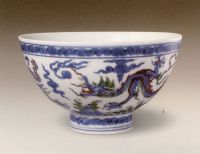 说 明: 此碗把青花与红绿彩结合起来,在一条龙身上,既有青花,又辅以红绿彩,在色彩上比前朝龙纹丰富.碗足内青花双圈"正德年制"四字楷书款,是正德时期具代表性的器物.