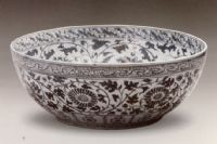 说 明: 此碗胎质坚细,釉层滋润.装饰繁密.釉里红的发色偏灰,具有洪武釉里红发色不够稳定的特点.