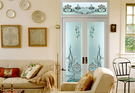 客厅的沙发尽可以摆放一些花花草草图案的靠垫,给居室带来绿意生机。在门上镶装几块玻璃砖,或者画上几笔都是不错的创意。