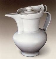 说 明: 僧帽壶阔颈,一侧有流,前伸似鸭嘴状.另一侧有宽带形曲柄.通体及足内均施白釉.