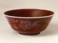 说 明: 红釉描金器始于明宣德朝.此碗金彩虽已脱落,图案仍依稀可辨.足内白釉.