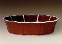 说 明: 此器通体施红釉,釉面匀净,釉色鲜艳.口沿与腹壁花瓣出筋处显露洁白的胎色,与洗身的红釉形成鲜明对比,相映生辉.虽无年款,确为宣德红釉器的稀有珍品.
