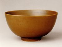 说 明: 碗敞口,深弧壁,圈足.通体施酱色釉,釉面光亮匀净.口沿因垂釉而显露白色胎骨.足内施白釉.