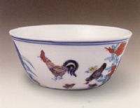 说 明: 鸡缸杯为成化官窑新创之造型,因杯似缸形又外绘子母鸡而得名,是成化斗彩瓷中的名品,属御用酒具.