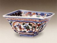 说 明: 方斗杯是明代嘉靖时期特有的器型之一.此杯整体构图较为饱满,青花与红彩为主要色彩.这两种色彩反差较大,鲜丽明亮,为嘉靖时期独特的用彩方法.