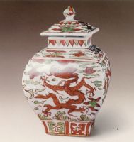 说 明: 此器主要以红、绿彩涂饰,仅在龙的肘毛处略点黄彩,充分体现了嘉靖五彩瓷红艳绿翠的艺术特色.