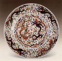 说 明: 此盘构图饱满,画面突出红彩,艳丽夺目,为万历五彩瓷器中之精品.