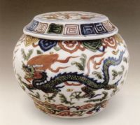 说 明: 此罐形制规整,纹饰流利,色彩鲜艳,是万历时期景德镇五彩瓷器中的典型作品.