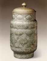 说 明: 此罐呈灯笼式,口足相若,俗称"壮罐".造型新颖,印花清晰,是明代龙泉青瓷中的精品.