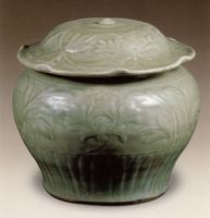 说 明: 此罐施满青绿色釉.胎体厚重.纹饰划刻生动,枝叶缠绕,莲花盛开.