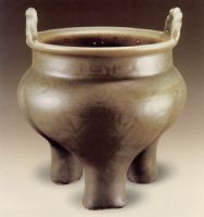 说 明: 整体仿古代青铜器鬲的造型.纹饰刻划较随意,罩釉后显得不甚清晰.通体青釉光亮温润,全器朴茂敦厚.