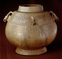 说 明: 此器为仿商青铜提梁卣式样烧制.造型古雅,工艺精细.为稀世之作.