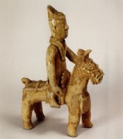 说 明: 灰胎,刷青釉,胎釉结合不好,部份脱落.该俑人物面部及冠与马头饰,雕刻细腻传神,不失为早期青瓷模俑类的优秀作品.