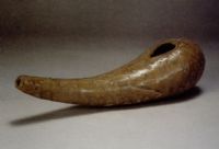 说 明: 平底露胎,胎质灰白.里外均施青黄色釉,有细小片纹.施釉较薄,有剥釉现象.为兽医灌药之器.