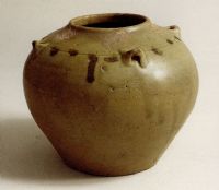 说 明: 通体施釉,釉色青淡而显白.肩部除附有四个横耳外,各耳间饰有褐色点彩.