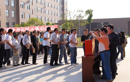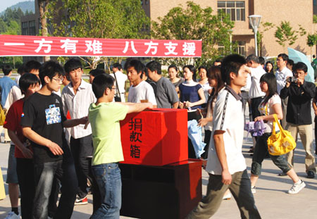 仪式结束后,校领导带头走向捐款台,将自己的爱心款放进了大红的捐款箱。聚集在主教学楼、逸夫楼前的师生们也都依次走向捐款箱,慷慨解囊,毫不忧豫地捐出自己的爱心款。大家以实际行动表达了对灾区人民的深切关心。