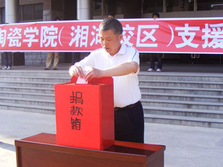 在捐款仪式上,党委书记肖任贤作了爱心捐款动员讲话。他在讲话中指出,四川汶川地震灾难深深地牵动着陶院全体师生的心。灾情发生后,陶院师生都深为悲痛,时刻关注地震灾情。学校专门召开党委会,研究布署向汶川地震灾区捐款献爱心工作,工会、团委、学生会等群团组织和全校各单位也立即行动起来,及时了解陶院来自灾区师生的家庭受灾情况,并倡导全校师生通过各种方式向受灾地区献爱心。要大力发扬一方有难、八方支援的民族精神,全力支援和帮助受灾地区。全体师生要积极行动起来,积极参与这次爱心捐助活动,为灾区群众排忧解难,共献一片爱心,送上一份温暖,踊跃捐款捐物,用实际行动,帮助受灾群众恢复生产,重建家园。全校各级党团组织和工会组织,要认真组织好这次抗震救灾爱心捐款活动,确保每一位老师和同学的爱心都能得到及时表达。