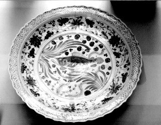 元青花如今在国际拍卖市场上拍出了天价,这里展出的一大批器物,让人看得眼花缭乱。那件鱼莲纹大盘足有二尺见方,画面相当传神,四周水草丰盛,中间鳜鱼生动。外圈的莲花纹构图也十分巧妙,莲“中通外直,不蔓不枝”,寓意深长。