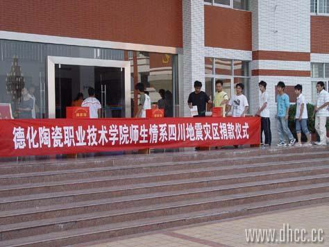 5月14日下午,我院在行政楼前举行了“德化陶瓷职业技术学院学院向四川灾区捐款仪式”。院领导陈师宪副书记简要的介绍了四川的受灾情况,并号召全院师生员工积极行动起来为灾区献爱心。学院党政领导陈师宪、吴志伟、董美斌、林诗锋、张南章和全院师生纷纷慷慨解囊,为灾区的人民送去一片爱心,不到半小时,全体师生就已捐出18413.3元。学院将在第一时间内,把捐款资金全部转交给民政部门。