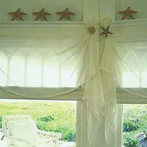 这一种装饰窗户的方法特别适合喜欢大海的你。将渡假时购买的海星等贝壳选出完整漂亮的一些,背后用万能胶将圆头图钉粘牢,用它们将白色的窗纱钉在窗户上方的窗框上,窗框上方再摆放几支美丽的海星,大海的味道就带回家了。