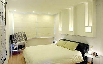 从房门进入,就是睡床所在之处。这里的色调以乳白色为主,床头墙壁的设计,融入柔和的灯光,配上两旁宛如小蜡烛的床边灯,使得整个房间的气氛变得额外祥和。