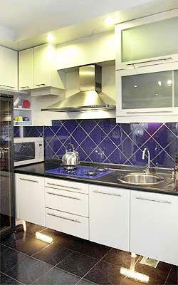 推开一边的折门,就是两排衣橱,中间是浴室的入口处。灰紫色的壁橱,黄色的墙壁,使得这个空间的色彩顿时丰富起来。