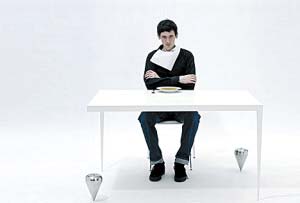 一张桌子四条腿,这基本可以说是个常识,造型古怪的桌子当然可以除外,但是上面图中这个造型很中规中矩的长方形桌子,却只有两条腿。 两条腿的桌子一定站不稳,这基本也是个常识。但是这张桌子残缺的两条腿的地方用很细的绳子吊上了两个很重的铅锤。你觉得,这桌子能站稳吗?