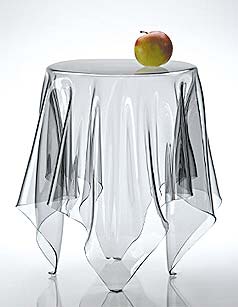 硬质腈纶材质,手工打造,颠覆人们对桌子和桌布的惯常理解。我们见惯了四条腿的桌子和桌子上垂下的柔软的桌布,这次看起来貌似柔软的透明桌布居然四只脚立在地上,是不是很新奇呢?
