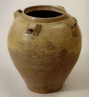 说 明: 器物通体施青灰色釉.器型瘦长.肩部附四个桥形耳,这是东晋、南朝时期特有的器耳形式.
